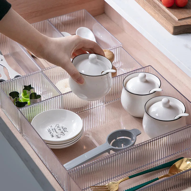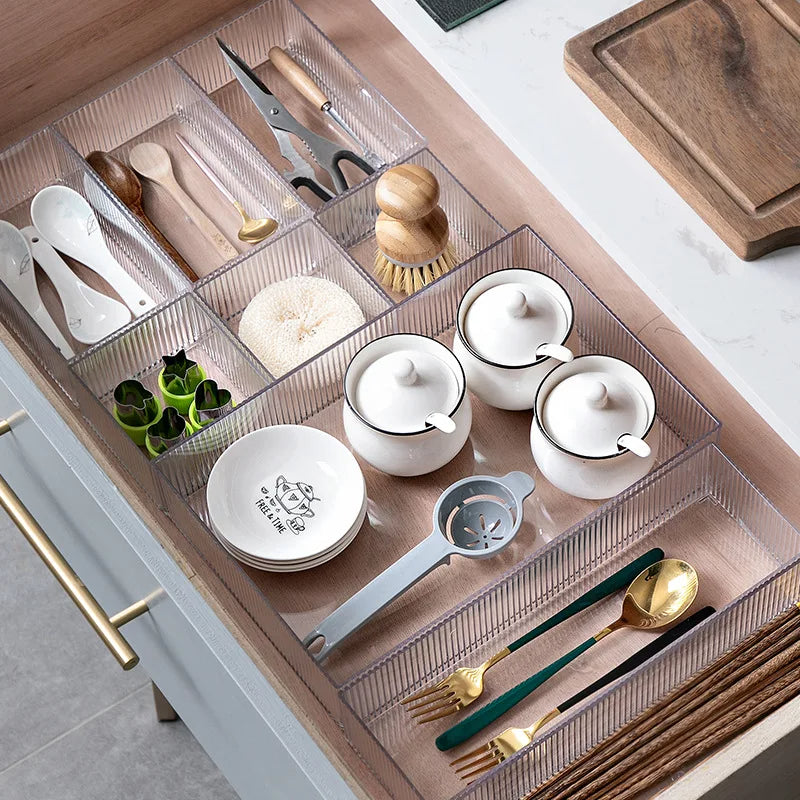 "Maximize your drawer space and keep your belongings organized with our acrylic drawer organizer! Made from high-quality acrylic material, this organizer is durable, easy to clean, and resistant to scratches and cracks. Its transparent design allows you to see what's inside, making it easy to find what you need. Customize your storage with our adjustable compartments and dividers. Perfect for kitchens, bathrooms, bedrooms, or offices. Keep your drawers clutter-free and organized with our acrylic drawer organizer!